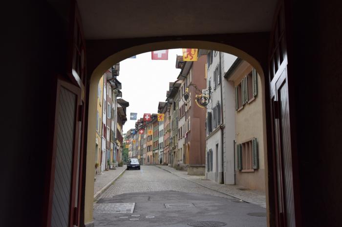 Нырнув под одну из арок, внедряемся в старый город и сразу же окунаемся в присущую исключительно Швейцарии атмосферу – с развешенными поперёк улиц флагами, штандартами и вымпелами.