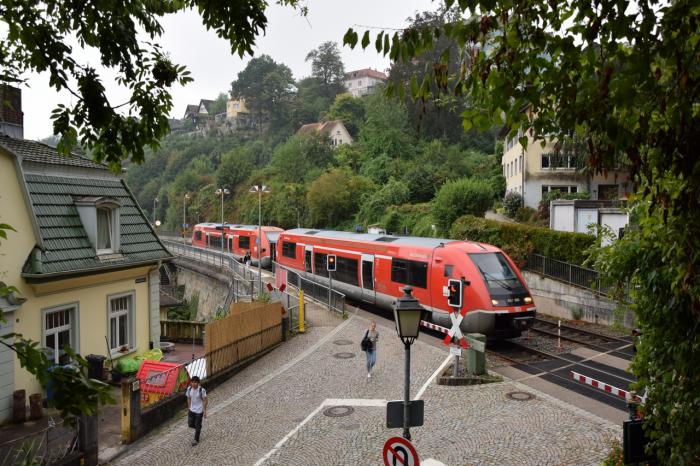 При виде подобных красот я без раскачки вхожу в образ «автофотокорреспондента», как меня иронично называет дочка, и, забыв обо всём на свете, начинаю хаотично перемещаться в поисках сюжетов и ракурсов для фото. В данном конкретном случае метнуться можно было только резко вниз – поближе к Рейну, что мы без промедления и сделали. Через считанные секунды оказались на местной железнодорожной станции, на которую очень кстати бесшумно вкатился региональный экспресс.