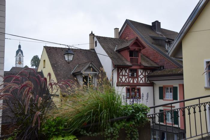 Но вернёмся на минутку к циферблатам и часам. Как и положено типичному швейцарскому городу, их в малюсеньком историческом центре Лауфенбурга в изобилии. Чтобы убедиться в этом, стоит лишь пошире открыть глаза, как в случае с колокольней церкви св. Иоганна.