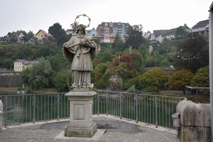 Установленный на швейцарской стороне святой мученик Ян Непомук с такой нежностью ласкает распятие, словно это младенец, а сам он – мадонна.