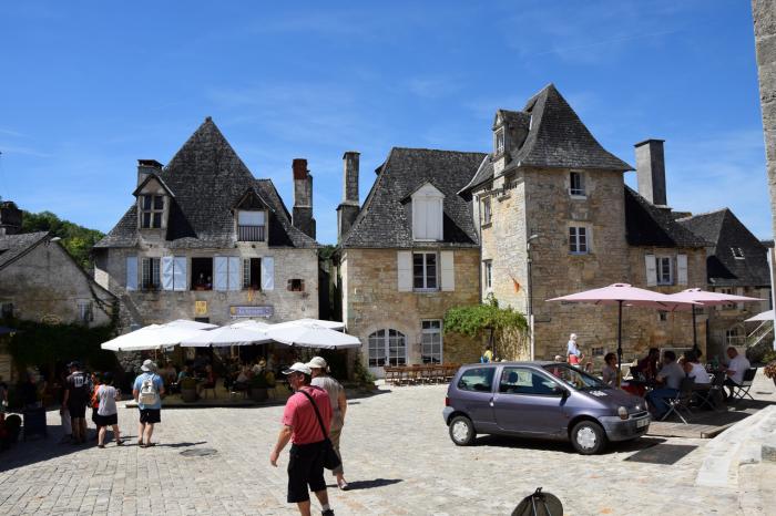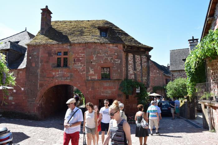 К первой деревне Коллонж-ля-Руж (Collonges-la-Rouge) мы добирались узкими лесными дорогами в полном одиночестве. Поэтому забитый практически под завязку огромный платный паркинг у стен деревни явился для нас полным откровением. Стоит заметить, что, если бы не эта бурлящая стоянка, можно запросто проскочить мимо Коллонж-ля-Руж, так как деревня притаилась в низине и с дороги почти не просматривается.