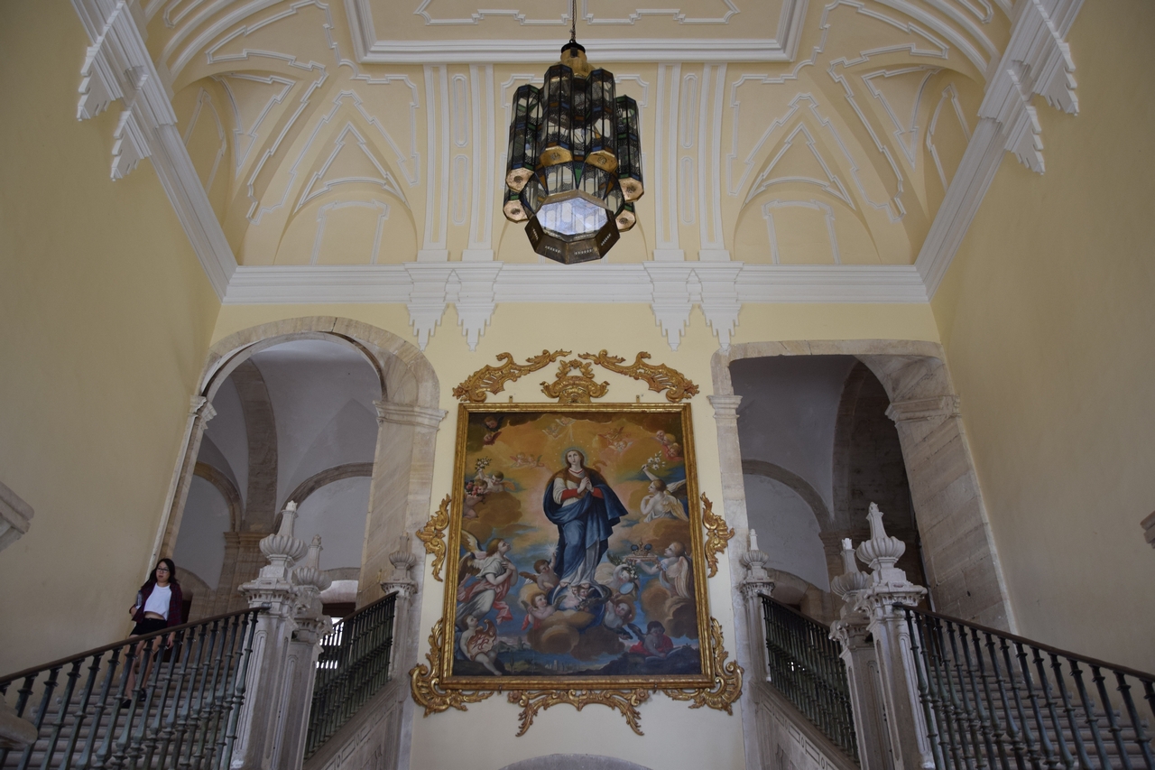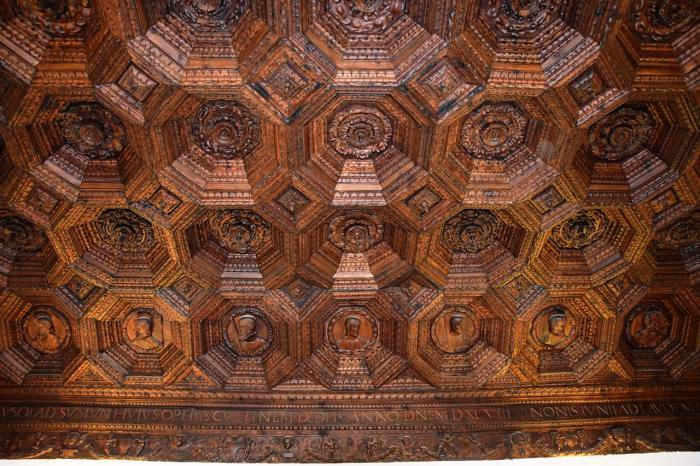 Потом была трапезная со сногсшибательным резным деревянным кессонным потолком. Здесь цифра 36 всплыла вновь – по количеству кессонов по периметру свода. Но важнее другое. Во всех этих 36-ти кессонах вырезаны филигранные бюсты мастеров, настоятелей и рыцарей ордена Сантьяго.