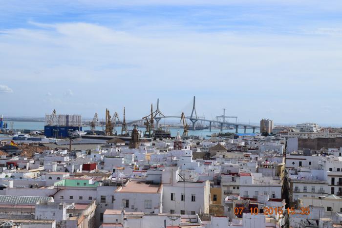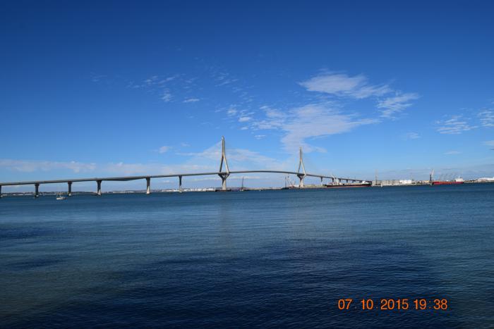 От Севильи до Кадиса 120 километров по автостраде АР-4. На этой скоростной дорогое есть платный участок с бесплатным дублёром. В появившейся дилемме, что экономить время или деньги, победило время, т.к. оно бесценно. Поэтому до Кадиса добрались за час с «копейками». Наш «Гармин», даже с «обновлёнными» картами, дорогу через залив по новому мосту не знал,