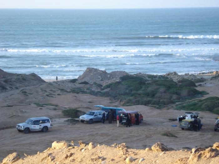 Дорога, от первой палаточной ночевки до последнего очага марокканской цивилизации – Дахлы, около 900км. Этот отрезок мы всегда разбиваем на две части с промежуточной ночевкой в палатках. Во первых, во вторых и в третьих: дорога идет вплотную к океану(очень красиво), темнеет рано, да и посидеть вечером “у камина” под шумок океанской волны — очень даже приятное действо. Но в 2008-ом этот кайф мы сами себе обломали.