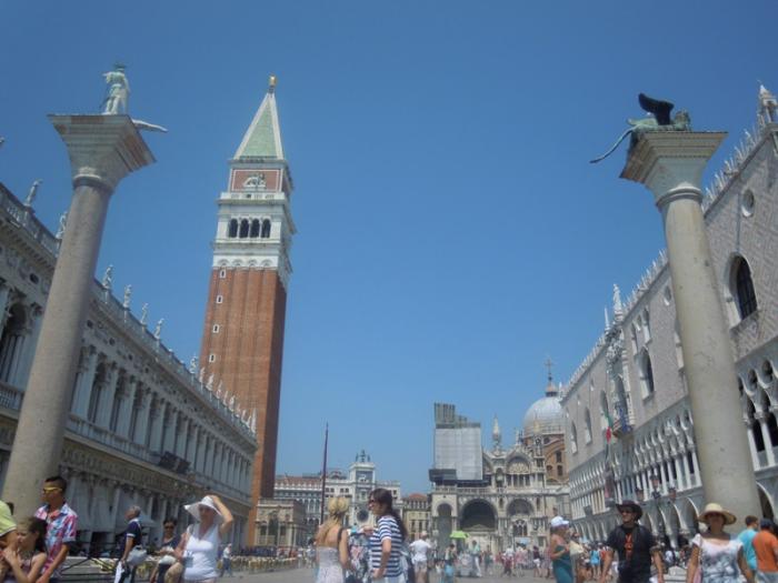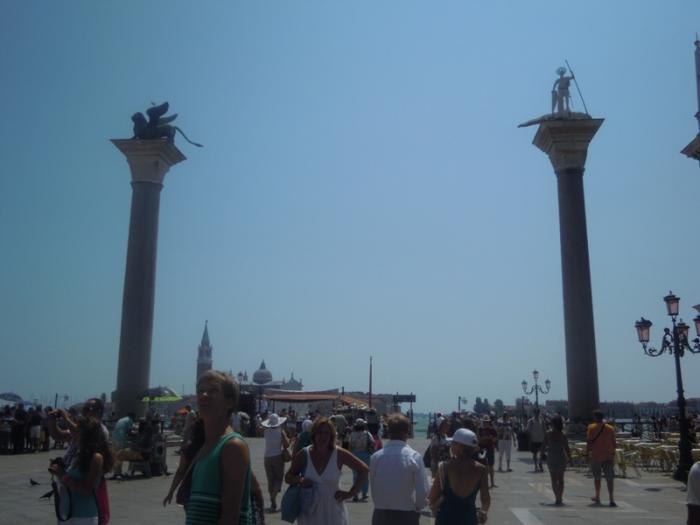 Площадь Святого Марка. Колонны из красного мрамора, на одной установлена статуя Святого Теодора, на другой — бронзовый крылатый лев — символ Святого Марка.