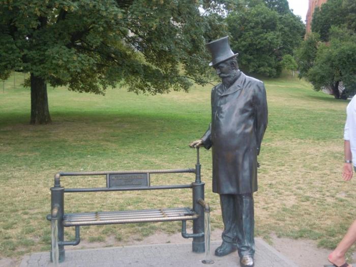 Такой интересный памятник-скамеечка-фонтан. Вообще, это памятник Вильяму Линдлею. В.Линдлей был английским инженером, по его проекту его младший сын устроил систему канализации и водоснабжения Варшавы.