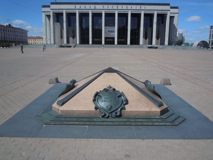 Дворец Республики и знак «Нулевой километр Беларуси».