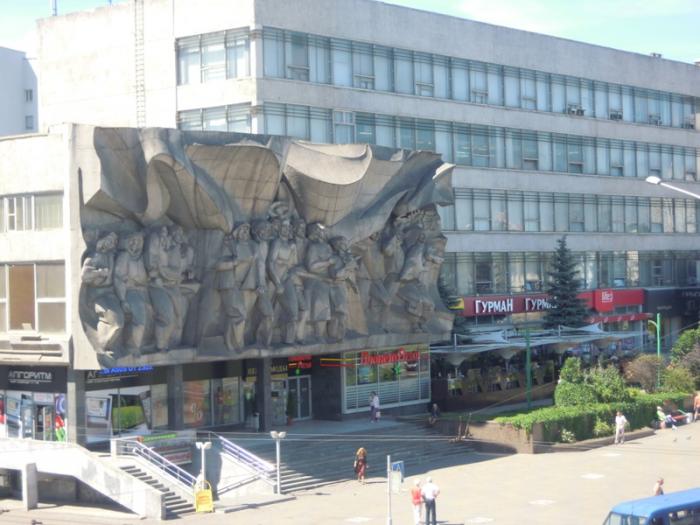 Дом моды. Здание постройки советского периода, украшено горельефом «Солидарность», скульптор А. Артимович. Тоже вид с моста.