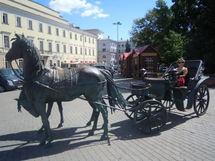 Скульптурная композиция «Экипаж губернатора Захария Корнеева» (автор В. Жбанов) на площади Свободы. Захарий Корнеев был первым губернатором Минска после присоединения Беларуси к Российской Империи.