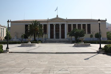 Мы спустились вниз к станции метрo Acropolis. Метро в Афинах простенькое, красная линия да синяя. Зеленая пока только растет и строится. Билет 1,5евро. Вот по красной линии и проскакиваем пару остановок к станции Panepistimio. Здесь в ряд стоят несколько знаковых строений, Афинский универ, академия, библиотека. Все они выглядят величественно и помпезно.