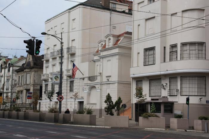 Недалеко от этих зданий без окон, стоит ещё одно интересное здание и оно тоже без окон. Но проёмы не сияют пустотой потому что нет проемов. Это здание американского посольства, и в нем все окна заложены кирпичом. Получилось что то типа дзота в центре Белграда, им здесь приходится держать оборону. Последний раз посольство жгли по моему всего три года назад.