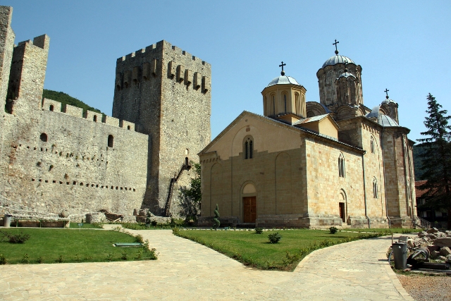 Монастырь Манасия выглядит как мощная крепость, стены толщиной в два метра и десяток башен по периметру.