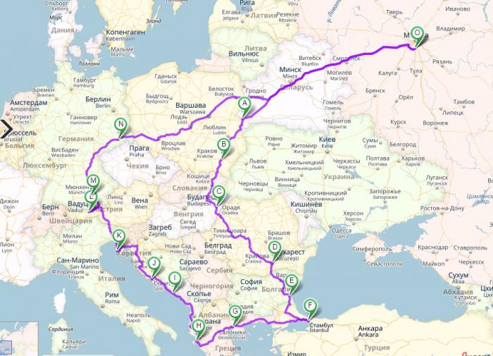 Маршрут: Россия (Подольск) – Польша (Жешув) – Венгрия (Дебрецен) – Румыния (Сибиу, Брашов, Бухарест) – Болгария (Солнечный Берег, Золотые пески) – Турция (Стамбул) – Греция (Халхидики) – Албания (Ксамил, Саранда, Берат) – Черногория (Будва) – Хорватия (Дубровник, Ровинь) – Австрия (Инсбрук) – Германия (Мюнхен, Дрезден) – Польша (Врослав) – Беларусь (Минск) – Россия (Подольск).