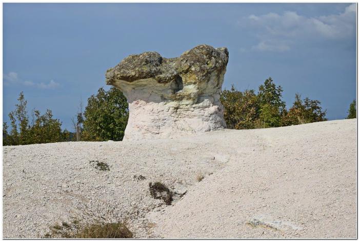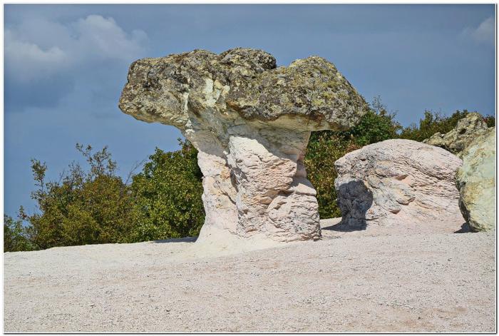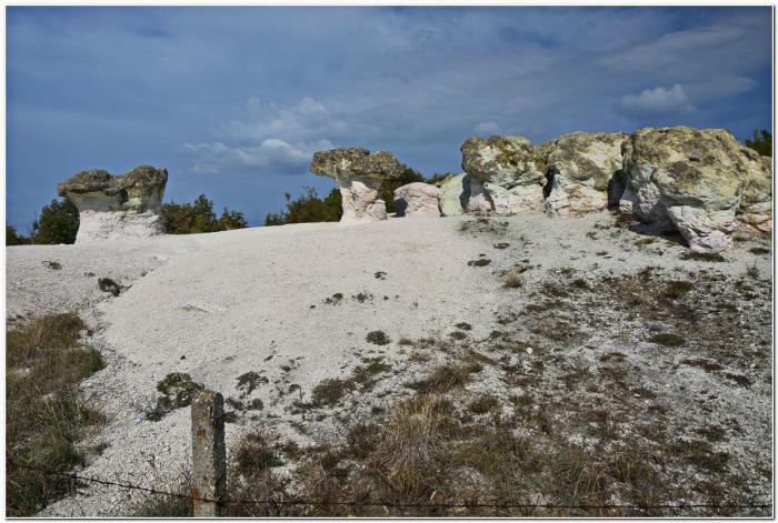 Каменные грибы (Каменни гъби). Нам это как раз по пути, но главное – не пропустить. А зевнуть их можно легко. Ехал я медленно, смотрел во все глаза, но все равно вовремя притормозить не смог, да особо и негде там это сделать, если прозевал пятачок у входа. Пристроившись в итоге где-то на обочине, побежал назад. Оказалось, что объект огорожен и допуск на него платный. Впрочем, рассмотреть всё можно и с дороги.