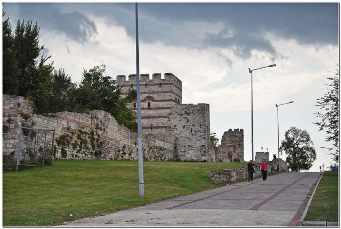 Дождь снова накатил, но мы уже успели запрыгнуть в трамвай, который должен был доставить нас на окраину исторического района Фатих к Феодосиевым стенам. Путь неблизкий – не менее 40 минут. За это время мы успели стать свидетелями потопа, который образовался в результате ливня, обрушившегося на центр Стамбула. Тем более удивительно, что в районе остановки «Пазартекке», где мы высадились из трамвая, пока было абсолютно сухо.