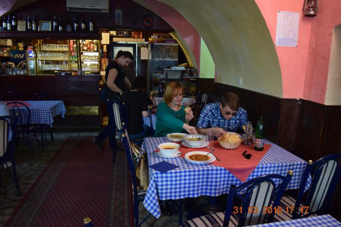 Здесь же на площади зашли пообедать в трактир «Четыре льва» (Četiri lava). Очень аутентичное место. Обслуживающий персонал в одном лице: бармен, официант и повар. Когда только успевает, но всё у неё хорошо получается и обслуживать и готовить. Это про даму, которая стоит в центре зала и принимает заказ.