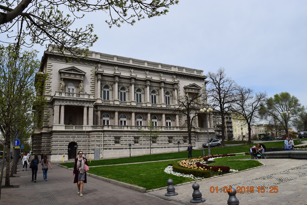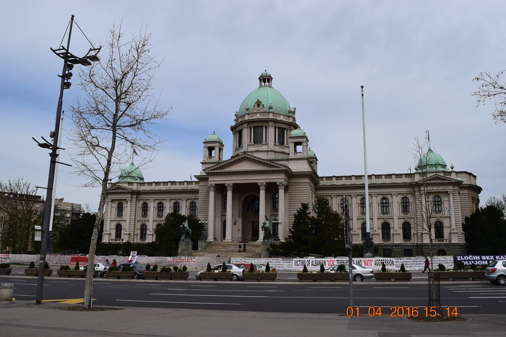 Напротив, через парк, скромно пристроилось представительство президента Сербии. Никаких заборов и шлагбаумов, только два гвардейца на ступеньках.