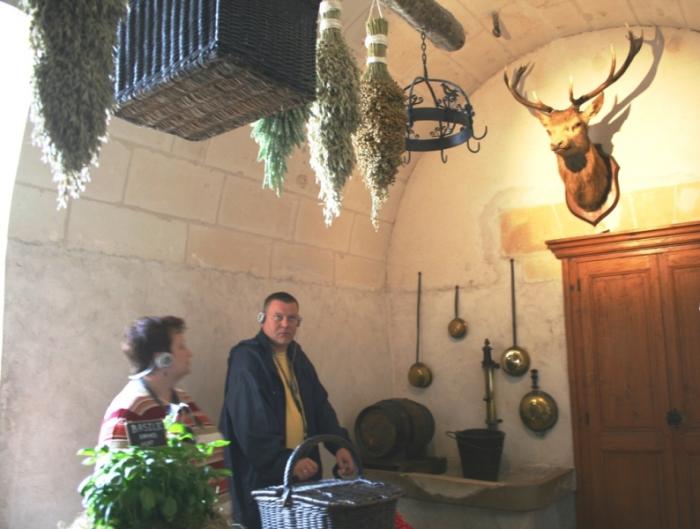 В двух мельничных опорах, на которых стоит замок, находится полностью оборудованная кухня эпохи Возрождения. Продукты в неё доставляли по реке, для чего у одной из опор был устроен причал. Кухня вызвала самый большой интерес. Вся утварь в идеальном состоянии. Медные кастрюли, ковшики, жаровни различной формы и величины начищены до блеска. От камина и очага пахнет дымом, поэтому создаётся впечатление, что здесь совсем недавно готовили еду, суетились повара и поварята.