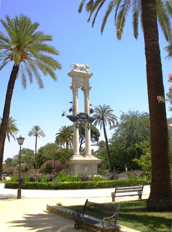Первое, что мы увидели в парке — памятник, посвященный открытию Америки Колумбом. Два белых столба символизируют Европу и Америку, они соединены каравеллой, на ее борту выбиты имена королевы Изабеллы и короля Фернандо, ведь Изабелла продала церкви корону из золота весом в 7кг, чтобы на вырученные деньги оснастить каравеллы. Над столбами лев — символ Испании.