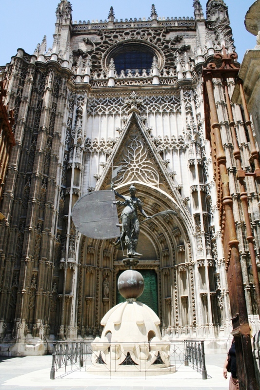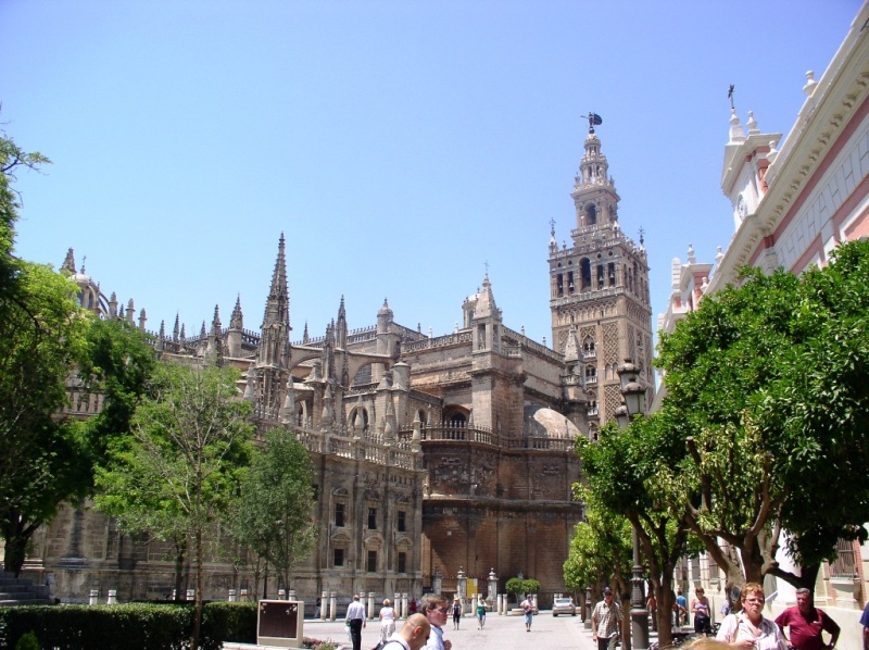 Екатерина рассказала много интересного, но запомнилось не всё — часть информации расплавилась на солнце… Несколько веков в Севилье господствовали варвары и мусульмане. В XIII веке город завоевал король Фернандо Святой. Не знаю, почему его назвали Святым, может быть он и заслужил, но по его приказу вырезали чуть ли не половину населения — 300 тысяч человек. Севилья снова стала христианской, в конце XIV века решили построить Собор. Он получился огромным, с поразительной архитектурой, но он всё равно сильно уступал по размерам Большой мечети, на месте которой был построен.