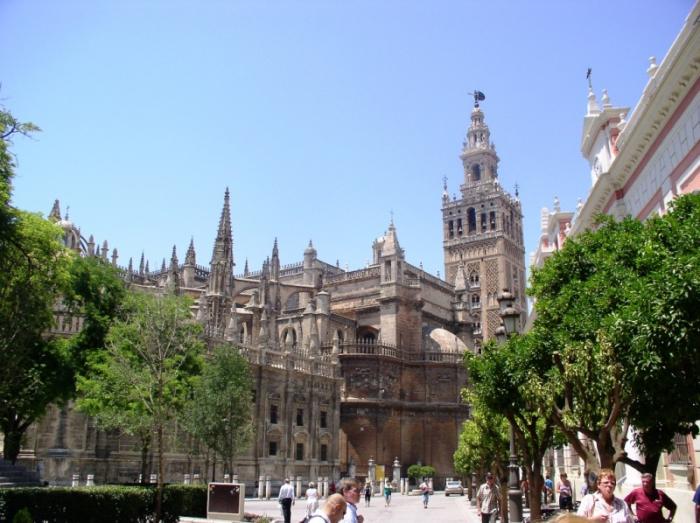 Кафедральный собор Санта-Мария. Это сооружение достойно подробного рассказа. Вот как о нём написал Немирович-Данченко: «Собор в Севилье – это нечто такое, после чего начинаешь понимать: народ мог погибнуть, создав подобное чудо, и не сожалеть о своей гибели. После такого страстного бешенного каменного порыва к небу надо было или унестись навеки от земли в его недосягаемую бесконечность, или упасть и разбиться до смерти».