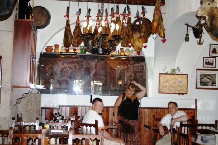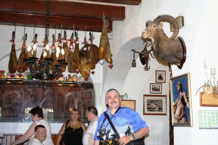 Перед входом в него на стене висит большая доска с меню, в первой строчке написано: «Jamon Iberica de Bellota». Это самый знаменитый в этих местах деликатес хамон — вяленая свиная нога, помеченная пятью «звездочками» (означает, что этот хамон вялили 2,5 года).