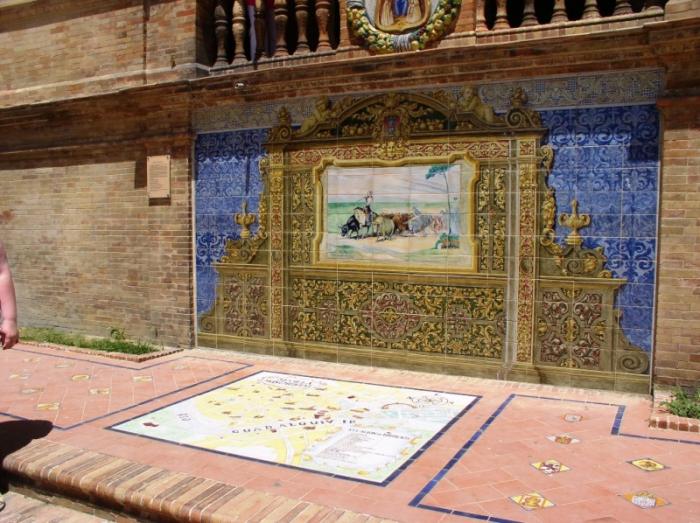 Он находится на полукруглой Площади Испании, в центре которой установлен фонтан. Здание почти полностью облицовано, расписанными вручную, цветными изразцами из Валенсии, Кордобы, Севильи и Толедо. Каждая испанская провинция здесь представлена мозаичной картиной. Екатерина, зная, куда мы дальше держим свой путь, подвела нас к мозаичному панно, посвящённому Канарским островам.
