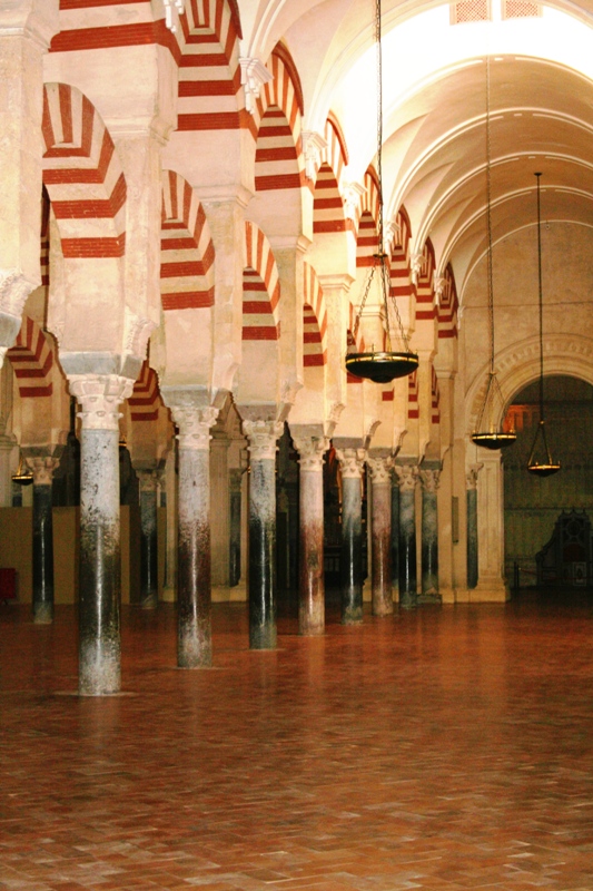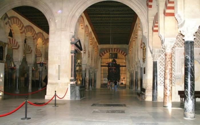 Колонны мечети венчают витиеватые капители, а вглубь интерьера уходит строй красно-белых арок. Современники сравнивали зал мечети с пальмовым лесом из-за более 1000 огромных колонн из мрамора, яшмы и оникса. Сейчас их осталось 856: часть была снесена при строительстве христианского готического собора.