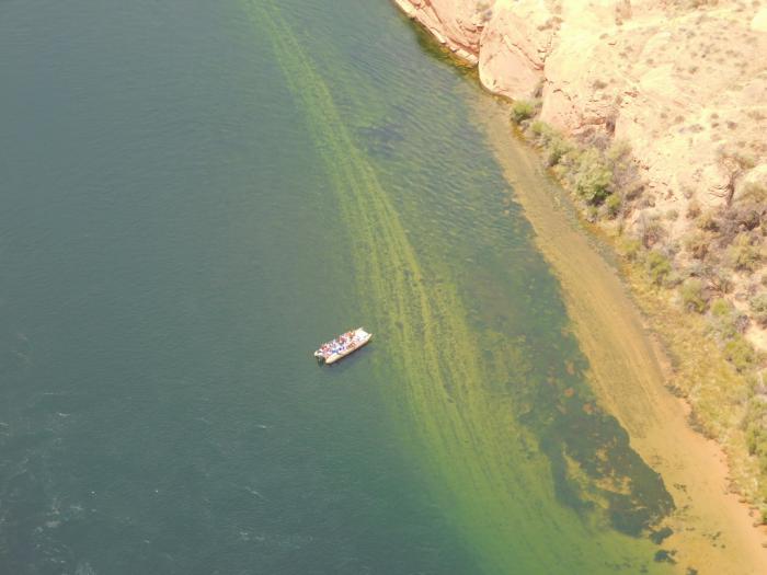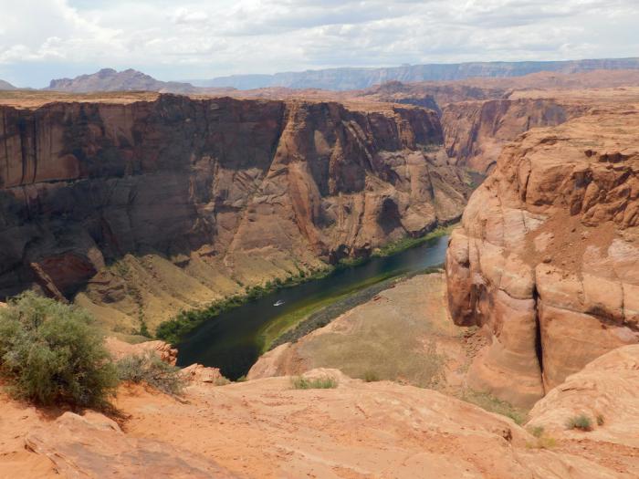 По реке Колорадо возят туристов, так что сверху можно было разглядывать и кораблики далеко внизу.