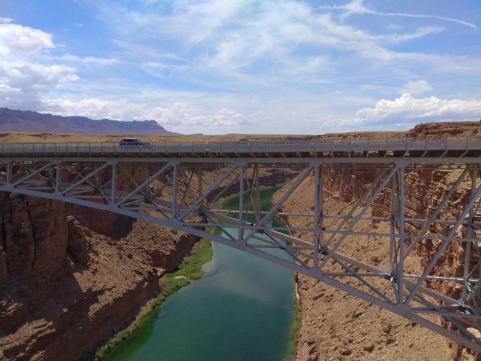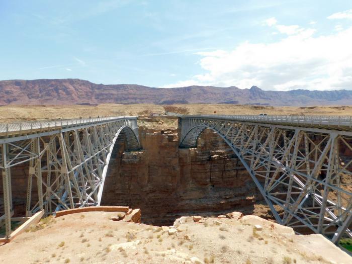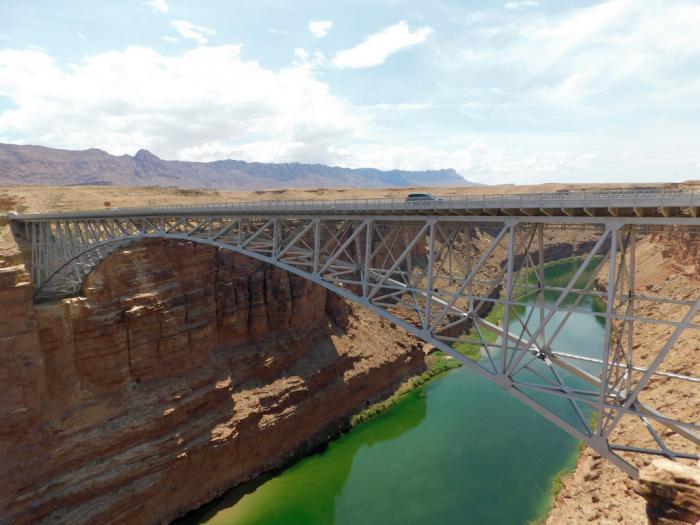 Вообще, эта водная артерия, так много всего вырывшая для туристов, не слишком избалована переправами. На 1200 км её длины приходится всего семь мест, где реку можно пересечь. Когда в 1928 году затонул паром, перевозивший повозки и автомобили в 8 км отсюда, дорога на другую сторону удлинилась почти на 1300 км. К счастью, лишь на несколько месяцев. Мост через Мраморный Каньон (Marble Canyon) реки Колорадо уже строился полным ходом, и в 1929 году соединил отстоявшие друг от друга на 221 метр берега реки. Мост сначала назывался Grand Canyon Bridge, но уже через пять лет его переименовали в честь краснокожих хозяев этих земель. В течение следующих 66 лет Мост Навахо исправно служил путешествующим из Юты в Аризону и обратно. Но со временем его недостаточная ширина и «грузоподъемность» стали очевидными. Вместо того чтобы переделывать историческую конструкцию, американцы построили рядом новый, максимально похожий видом. А старый с 1995 года закрыли для движения. Теперь его висящая в 143 метрах над рекой конструкция считается самым высоким пешеходным мостом в США. С него можно было в своё удовольствие пофотографировать реку и действующий автомобильный мост.