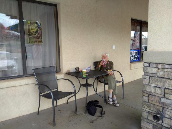 В 15:05 мы во Фредонии, а значит, снова в Аризоне. Пора пообедать. Можно было, конечно, навестить кафешку, послужившую нам по пути к каньонам. Но нам всё равно надо было заправиться, а на АЗС нашлись стулья и столик на улице, которые нам без вопросов разрешили использовать для организации походного перекуса.