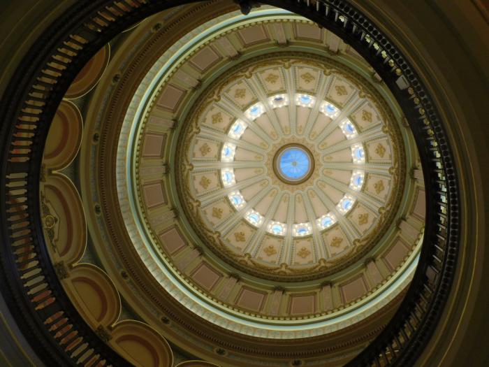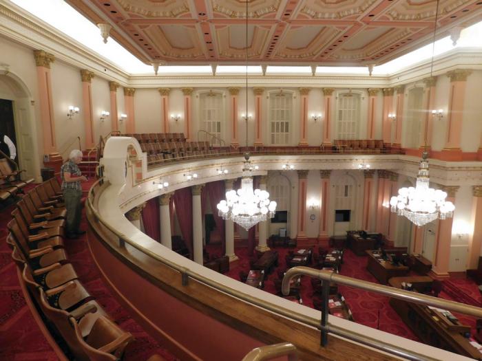 Потом молодой охранник, прогуливавшийся по галерее, попросил соблюдать тишину, не фотографировать и не перегибаться через ограждение. Я изумился: вроде суббота, неужто мы прямо на заседание попадём?! Но нет. В зале стали рассаживаться молодые ребята. Настоящие сессии парламента проходят по вторникам и четвергам. А это была «игровая сессия» для старшеклассников, которым предложили попробовать себя в роли законодателей. Позже, когда мы делились впечатлениями с нашим следующим хозяином, он проворчал: "Они всё равно ничего бы не испортили. Хуже, чем действующая в нашем штате власть, даже школьники-двоечники не могут управлять". =)