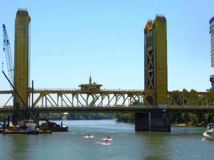Этот подъёмный (лифтовым способом) мост называется Tower Bridge. Хотя, на мой взгляд, вот же они, настоящие «Золотые ворота», в отличие от выкрашенного в красный цвет гиганта в Сан-Франциско. =) Кстати, этот мост в Сакраменто в 1935 году уже построили (вместе с паровыми подъемными механизмами), а Golden Gate тогда, во время визита Ильфа и Петрова, был на полпути к завершению. Ну всё, теперь не обидно, что во Фриско не побывали. ;) Шучу. Обидно, конечно. Но в Сакраменто нам тоже понравилось.