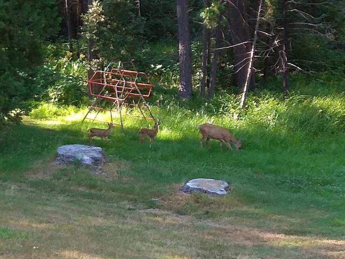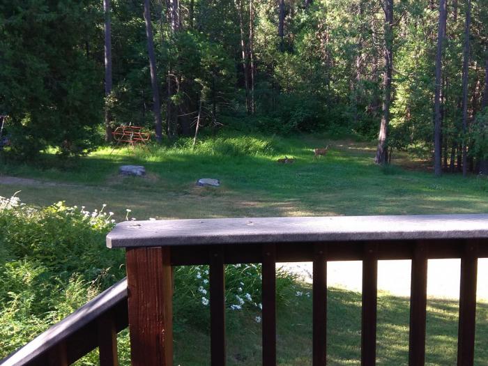 Пока мы наслаждались утренней тишиной и свежим воздухом, Билл продолжал рассказывать о прелестях жизни в маленьком городке. Их двор упирался прямо в лес. Наша хозяйка со вздохом упомянула, что раньше к ним и зверушки всякие заглядывали, включая олениху. Да вот что-то давно не видно её, не съели ли бедняжку? Я слушал с вежливой улыбкой — всё же мы были в двух шагах от асфальтированной улицы, не в дремучей чаще. И вдруг, прямо у нас на глазах, из леса вышла целая оленья семья и чинно прошествовала по заднему двору дома. Я понимаю, что это не слоны и даже не медведи, но вот как-то не привыкнуть мне было к завтраку на веранде, в компании лесных зверей!