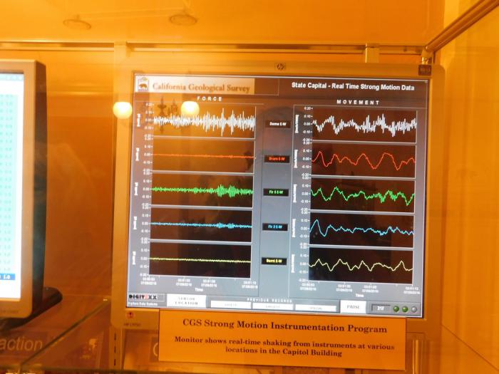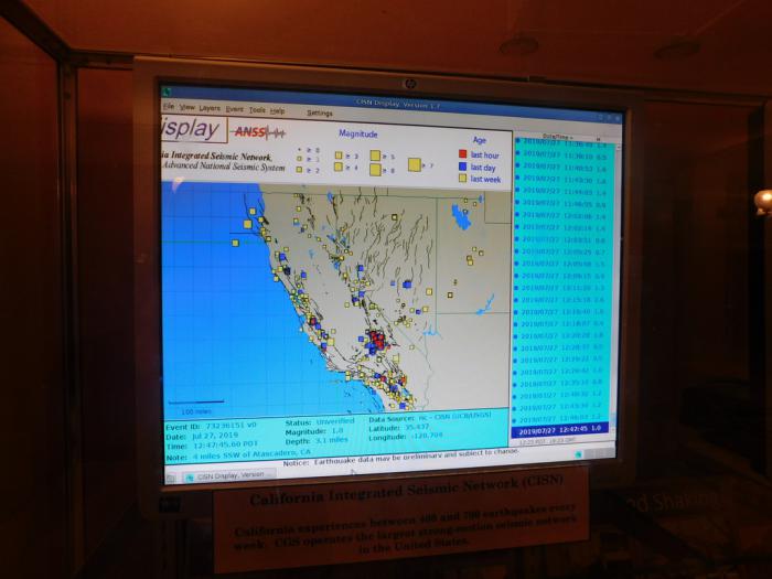 В музее нам демонстрируют, чем известна и вся Калифорния в целом. И, как мы на собственной шкуре выяснили в свой первый день в Сиэтле, — это, не в последнюю очередь, землетрясения. Их в «золотом штате» происходит 400-700 в неделю! Конечно, настоящие сейсмологи Геологической службы сидят где-то в другом месте, но тут нам тоже демонстрируют в реальном времени, где сейчас трясёт и с какой силой.