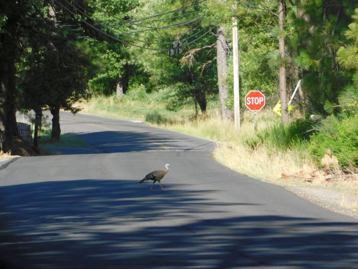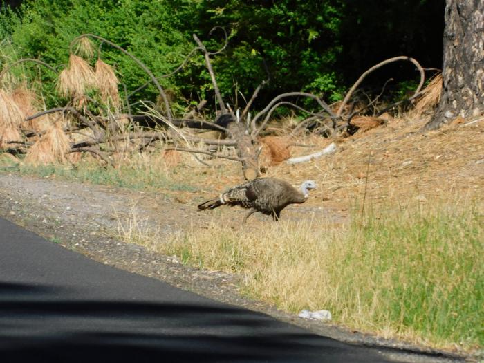 А когда мы в 9:30 уехали из дома Билла, наш путь тут же пересекла не такая экзотичная, но тоже несуразно выглядящая на дороге птица. Насколько я понимаю, это дикая индейка. Или индюшка? В общем, полуфабрикат для Дня Благодарения или Рождества. Сейчас в США поговаривают о запрете праздников в рамках борьбы с ковидом. А вот похороны запрещать всё же не решаются. Так многие американцы подумывают в период Рождества собираться на похороны этих самых индюшек (индеек?). =\