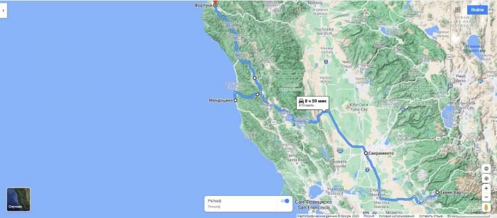 Пробег за день 479 миль / 771 км, от выезда из Twain Harte до въезда в Фортуну 12 часов, средняя скорость движения 86 км/ч