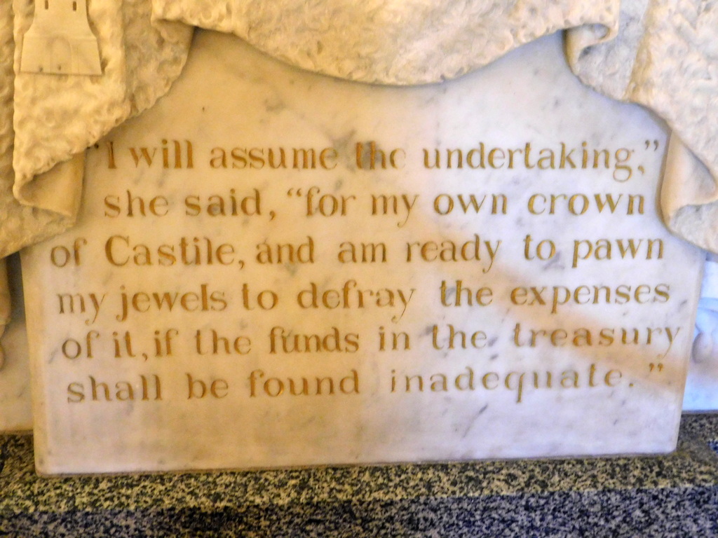 Здесь же в Ротонде, когда мы её посетили, стояла статуя Колумба. Он изображён получающим одобрение на свою знаменательную экспедицию от королевы Изабеллы. Как известно, Христофору отказали в поддержке в Португалии, Италии и Великобритании (справедливо указывая, что в географии он явный «троечник»). Королевская чета Кастилии тоже не решалась на авантюру несколько лет, и кто из них двоих сдался первым — спорят. Но фраза, выбитая на постаменте, приписывается именно королеве: «Я поддержу это начинание и готова отдать личные драгоценности, если в казне не хватит денег».