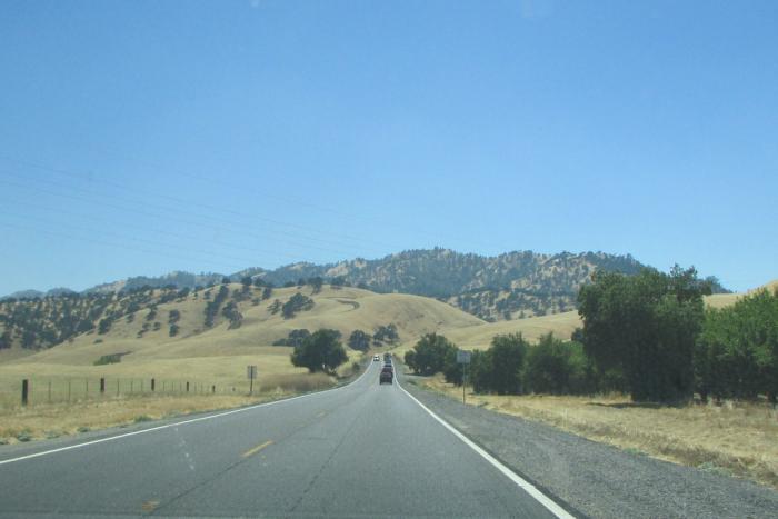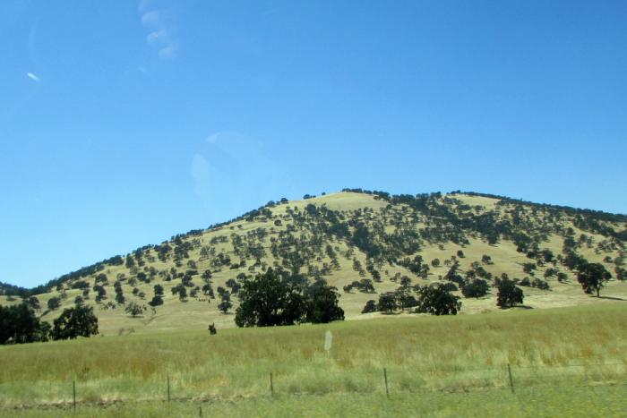 В 13:55 наш экипаж выехал из столицы штата на хайвэй №5. За бортом +41С. Хорошо, что кондиционер справляется. В 14:40, после 92 км по магистрали, мы съезжаем на дорогу №20. Лавируем между фруктовыми садами. Потом въезжаем в невысокие горы, покрытые жёлтой травой и зелёными деревьями.