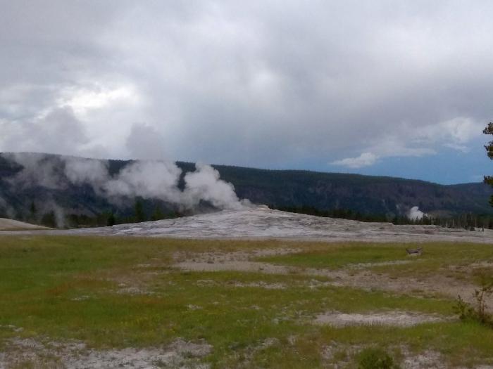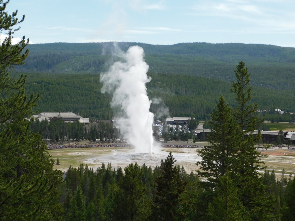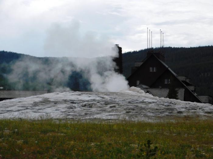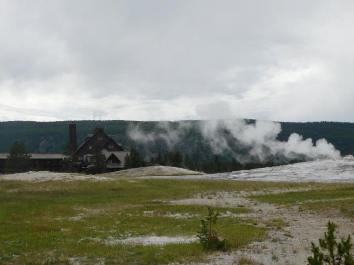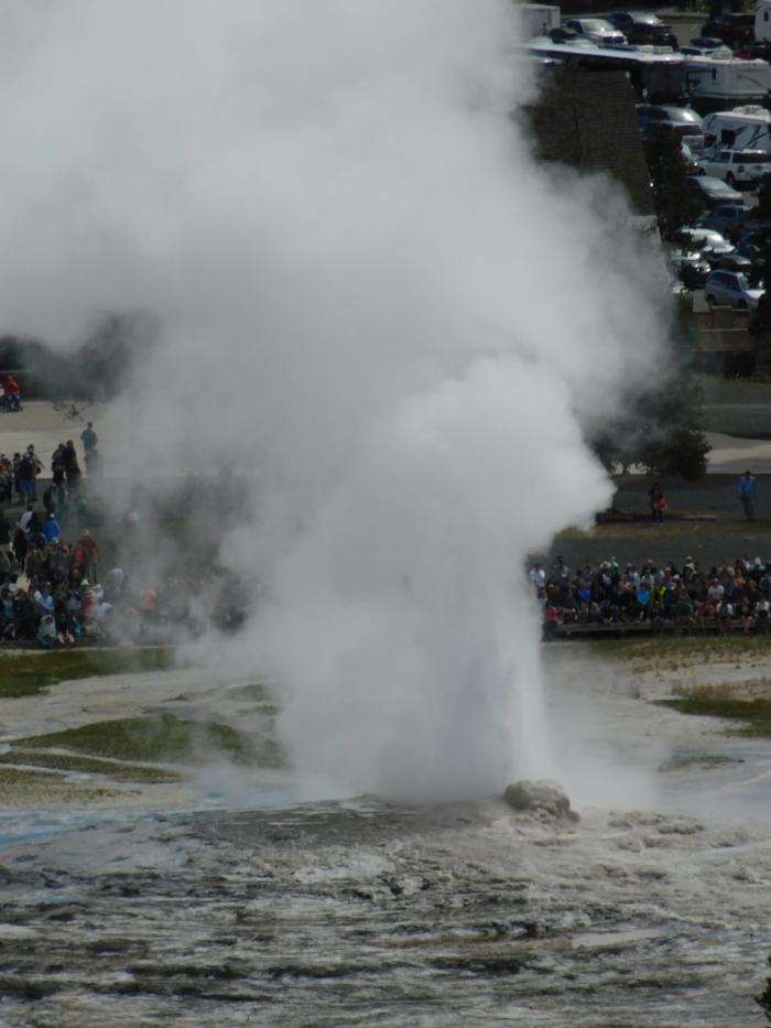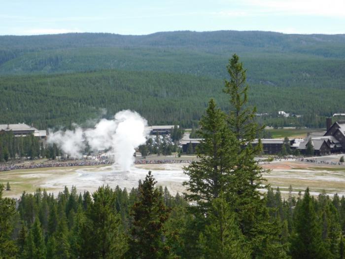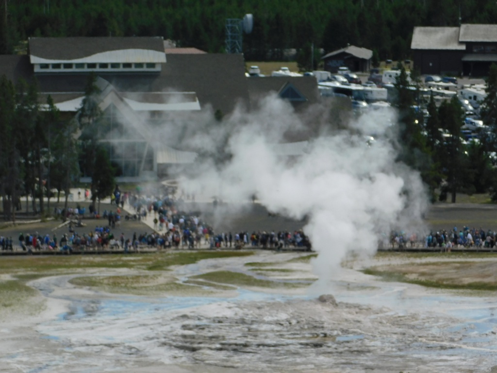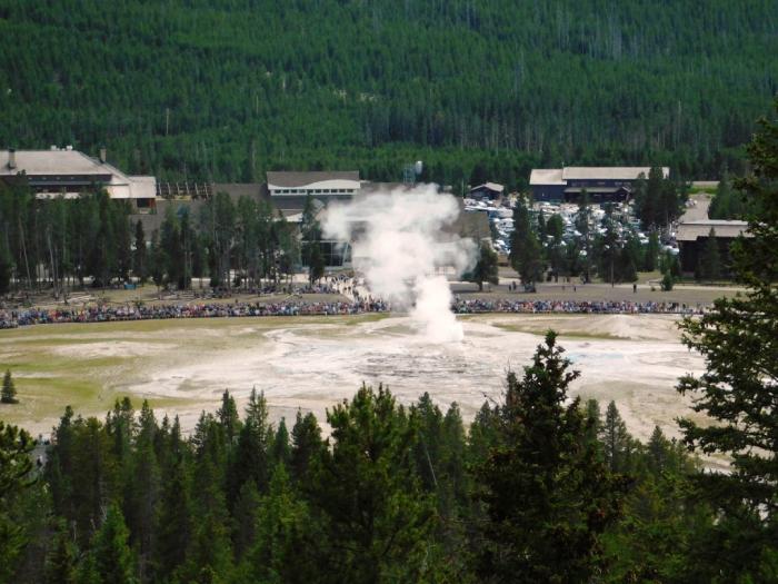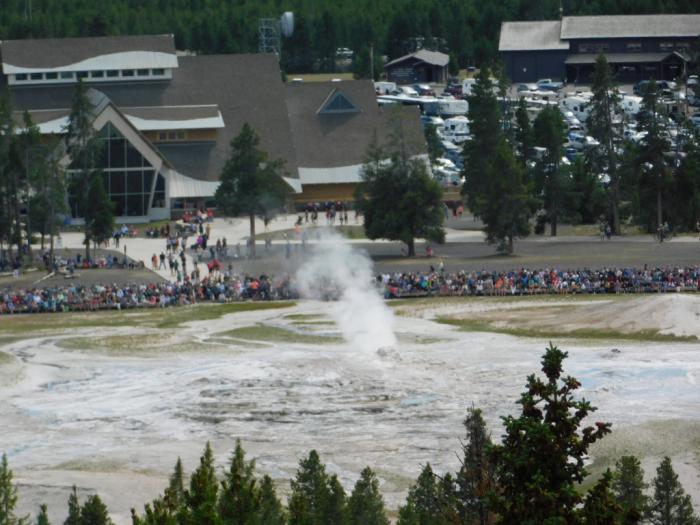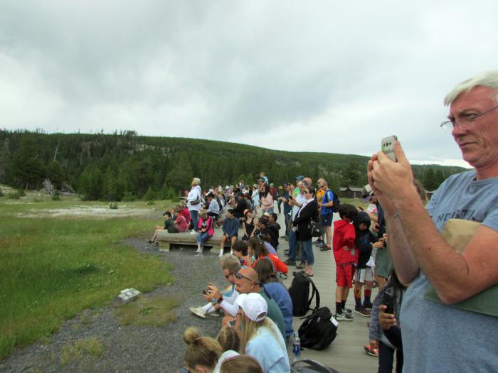 Народу хватало. Для многих американцев хоть раз привезти детей полюбоваться извержением по расписанию стало такой же неотъемлемой частью культуры страны, как игра в бейсбол и барбекю на заднем дворе дома. Раньше люди подходили почти вплотную к «жерлу» гейзера. В результате, классический конус Служаки расковыряли на сувениры, что, возможно, и на форму извержения повлияло. Теперь вокруг, на некотором отдалении от самого гейзера, построен «театр» с несколькими рядами скамеек полукругом. Большинство мест было уже занято, но (спасибо непогоде), тут всё ещё можно было найти место с хорошим обзором.
