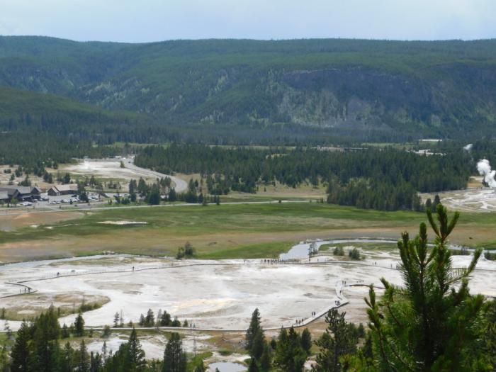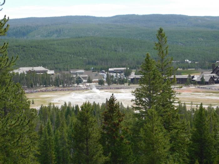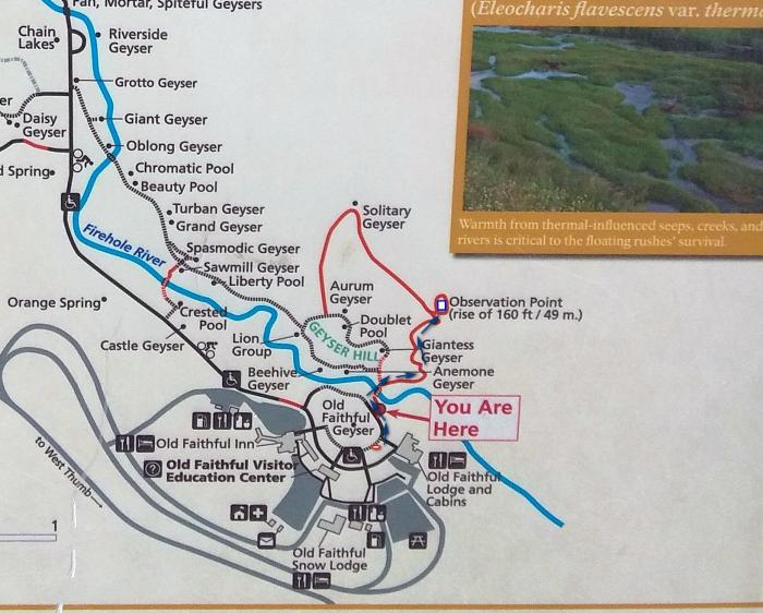 Пристроив маму, я как-то резко заскучал. Не хотелось мне сидеть тут среди зрителей, дисциплинированно дожидаясь, когда булькнет. Было у меня смутное воспоминание, что кто-то из наших предшественников нашёл менее засиженную точку обзора сверху. Внимательно посмотрев на приведенную выше схему, я вычислил смотровую площадку на 50 метров выше бассейна. Предупредил маму, что встретимся здесь после извержения, и рванул вокруг Old Faithful.