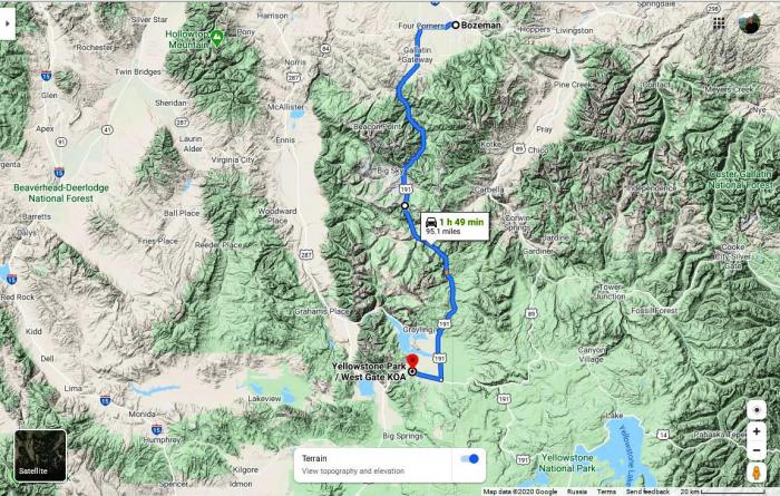 Исследование национального парка такого масштаба на глазах обретало очертания самостоятельного путешествия. Фан-клуб гейзерландии единодушно требовал для полноценного первого (!) знакомства с землёй жёлтого камня минимум 4-5 дней. И постепенно я начинал склоняться к тому, что они правы. Только у меня этих дней не было. В какой-то момент я начал приходить в отчаяние. А потом напомнил себе, что наша цель — получить удовольствие от путешествия, а вовсе не составить подробный атлас давно уже исследованного супервулкана. И всё же придерживаться прежнего плана было невозможно. Сначала я со скрипом согласился добавить ещё полдня на осмотр достопримечательностей. Потом подумал, что мы можем ночевать в Bozeman (примерно в 200 км от центра Йеллоустон) и сделать оттуда две однодневные вылазки к гейзерам. Наконец, под давлением знатоков, я сдался и решил, что одну ночёвку придётся искать в парке или рядом.