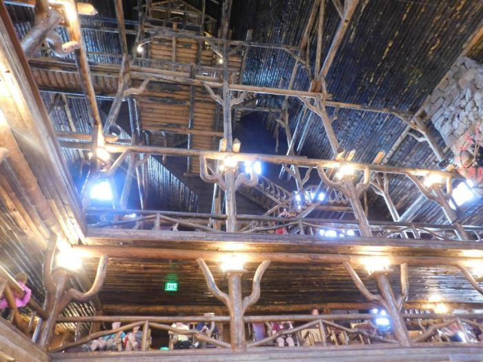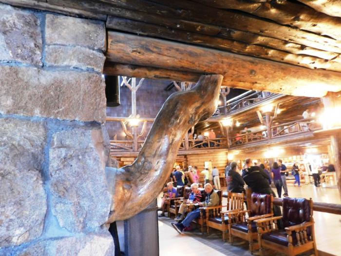 К тому времени я уже понял, что «супер-эффектный лодж», который я искал в West Yellowstone, находился вовсе даже здесь, возле Старого Служаки. Называется он Old Faithful Inn. Построили этот постоялый двор ещё в 1904 году из местных бревен и теперь считают крупнейшим бревенчатым зданием в мире. Впрочем, в США всё крупнейшее, величайшее, наикрутейшее и т.д. ;) Но это здание, и правда, немаленькое. И сделано с фантазией. Считается, что архитектор Robert Reamer воплощал в проекте свои детские фантазии о замках, викингах и прочих сказочных декорациях. Особенно всех впечатляет огромный холл с галереями по стенам.