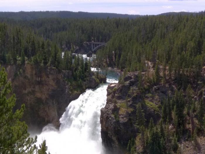 Продолжаем наше движение по перемычке «большой восьмёрки» на восток. В 12:05, примерно в 20 км от Норриса, проезжаем Canyon Village. Здесь развилка между северным и южным кольцом. Вообще, нам на север. Но мы хотим осмотреть каньон, который вырыла здесь река под оригинальным названием Yellowstone River (кстати, река Йеллоустон насквозь проходит сквозь озеро Йеллоустон). Вот ради каньона мы ненадолго и сворачиваем на юг в плотном потоке машин.