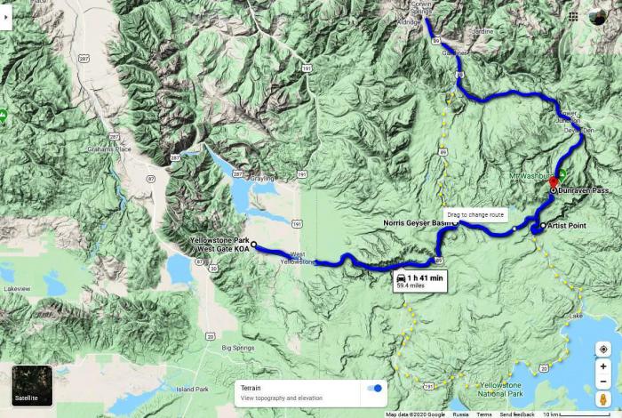 Жёлтым пунктиром на карте, если приглядитесь, обозначена остальная часть большой йеллоустонской восьмёрки. Скоро вы будете в ней ориентироваться лучше, чем мы (по крайней мере, чем в начале нашей экспедиции). ;)