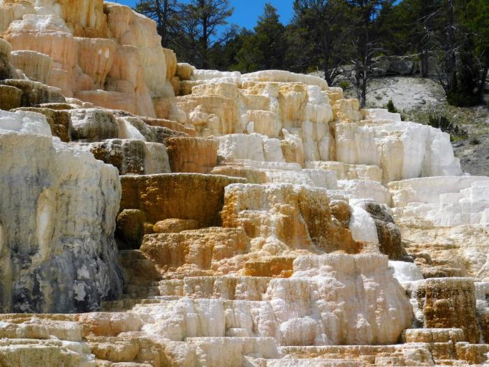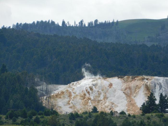 Потратив полчаса на перекус, наш отважный экипаж с новыми силами дремлет в машине. По крайней мере, половина экипажа дремлет, а другая всё же вполглаза за дорогой поглядывает. И не зря. Среди зеленых лесов вдруг белоснежным холмом возникает Mammoth Hot Springs.