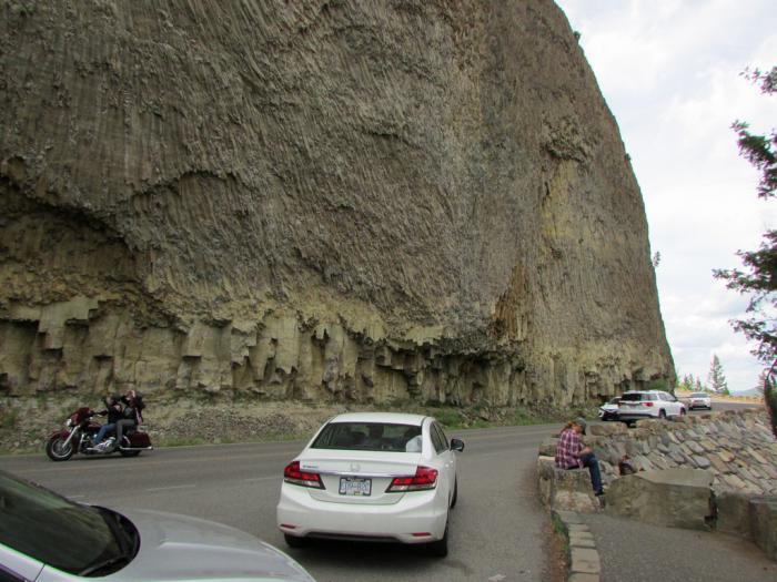 К счастью, бизон не перегородил дорогу — такое тут тоже не редкость. Так что, миновав его, мы вновь мчимся без особых препятствий. И, однако очередной пейзаж в сочетании с расширением дороги для парковки заставляют нас притормозить. Здесь шоссе проходит прямо под скалой. Проезжающие автомобилисты останавливаются, мотоциклисты, рискуя навернуться, задирают головы и фотографируют на ходу.