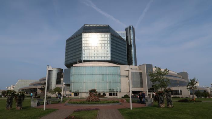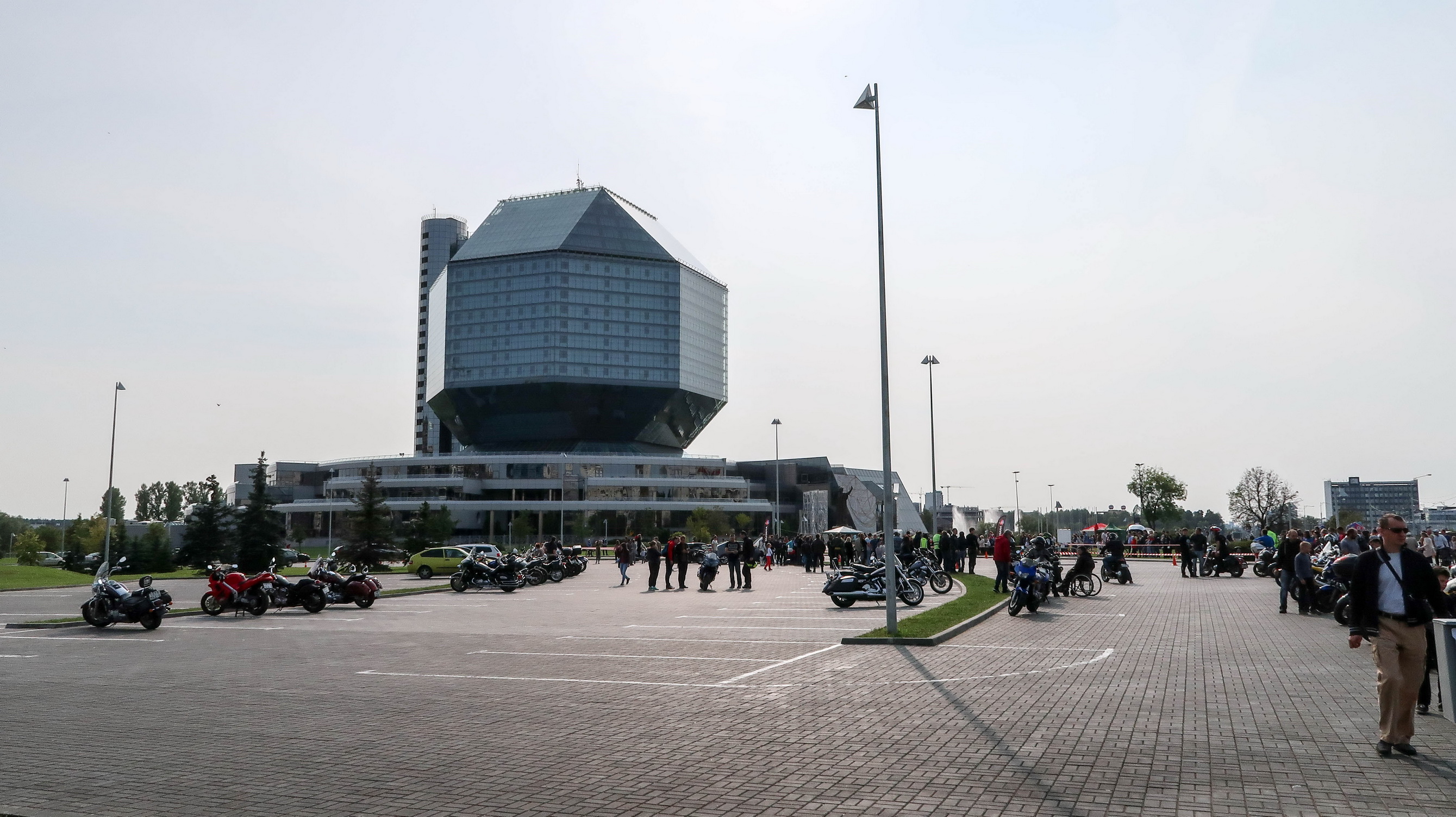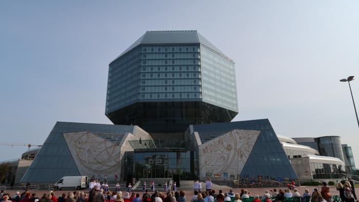 Замкнув круг по центру Минска решили прокатиться на метро и доехать до станции «Восток», вблизи которой расположены сразу две достопримечательности – Национальная библиотека Беларуси и Минский Всехсвятский храм. Если честно, то изначально мы поехали смотреть храм, а библиотека оказалась приятной неожиданностью, представшей пред нашими взорами на выходе из метро. У здания библиотеки во всю шли народные гуляния – резвились байкеры и выступали участники народной самодеятельности.