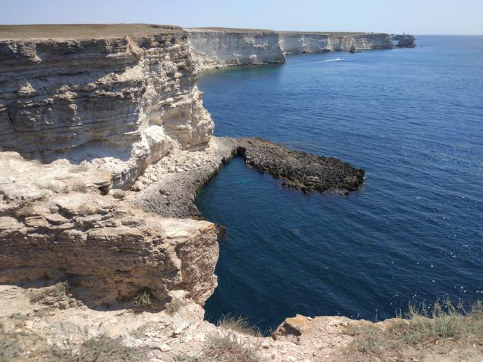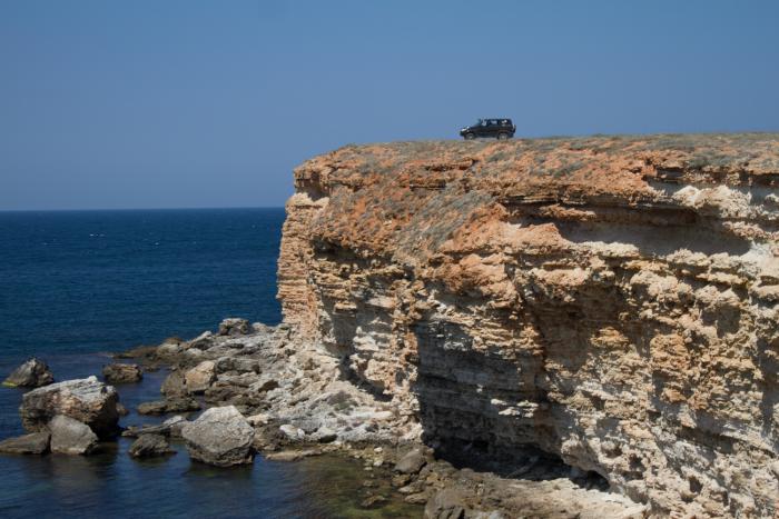 Дальнейшая береговая грунтовая дорога к Черноморскому очень похожа на Караларский природный парк в Керчи, балки, бухты, скальник, с одним важным отличием. Летняя Керчь это сепия: выгоревшая трава, коричневые скалы, перекати поле и колючки, разнообразие цветов минимальное. Тарханкут иной, степь тут не холмистая, а плоская, бесконечная как в Калмыкии, почва гораздо богаче, поэтому в степи преобладают зеленые оттенки, тарханкутский известняк бело-серый, скалы гораздо выше и живописнее.