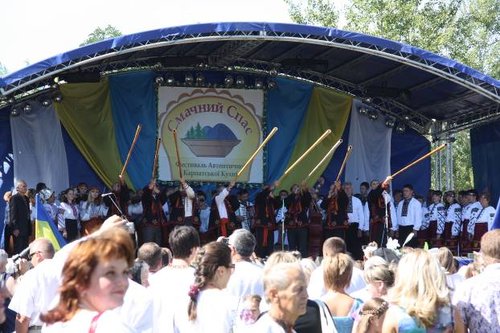 Затем со сцены разорвали воздух вздернутые к небу трембиты. Команда гуцул, прогнав через них несколько кубометров воздуха, буквально оглушила весь стадион.
